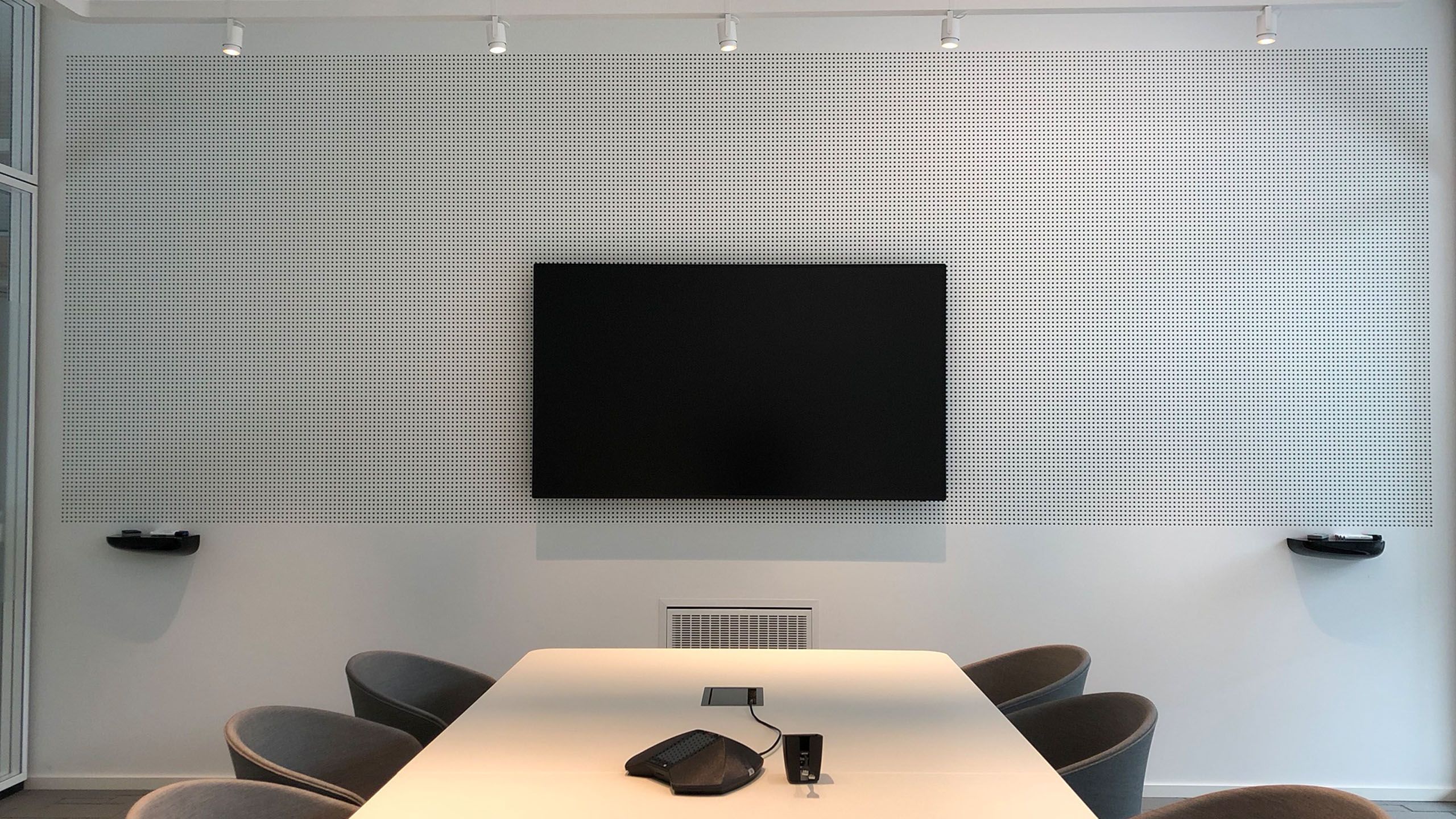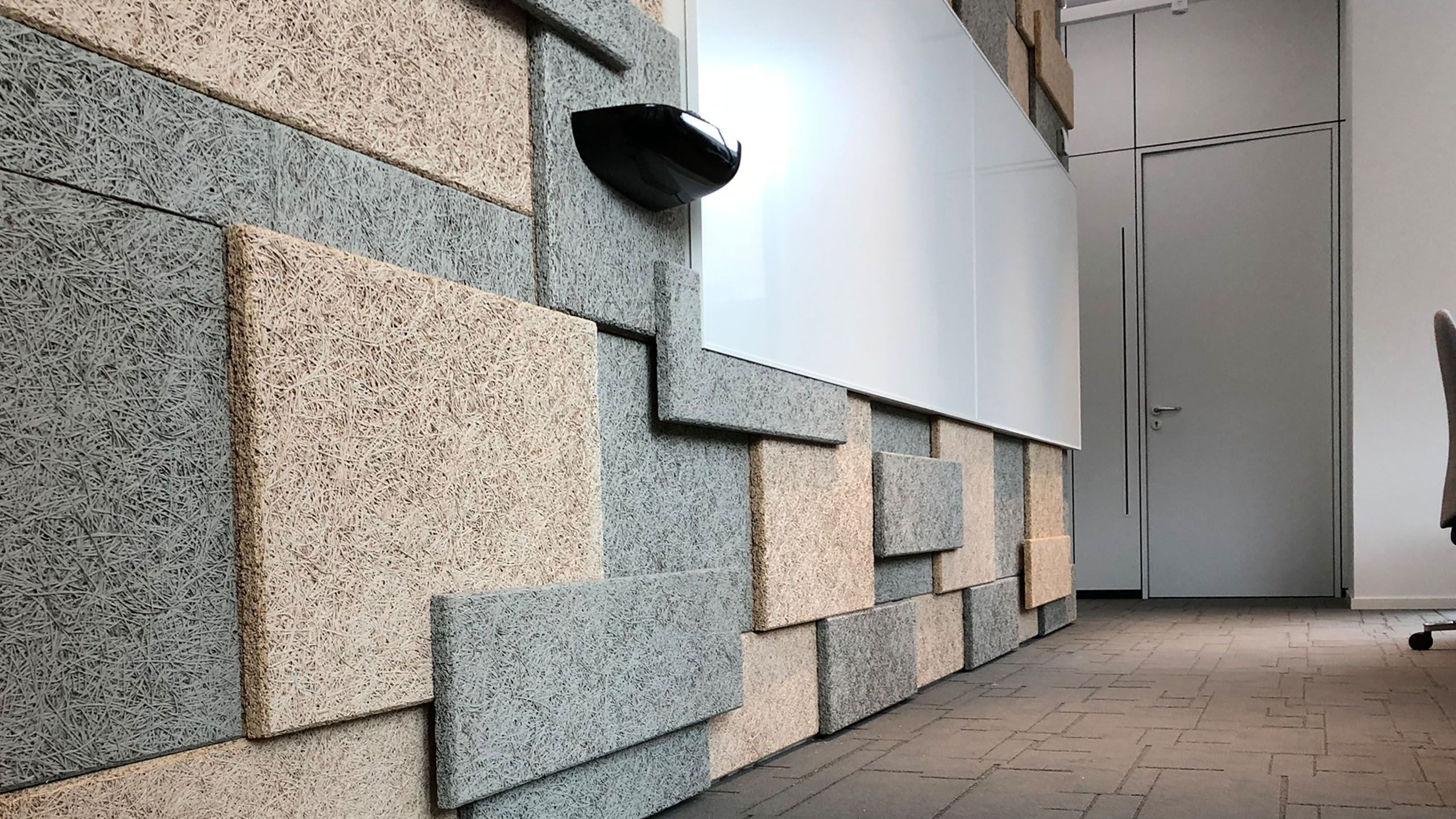 Schallschluckende Mineralfaserplatten ergeben hierbei eine schön anzusehende Akustikwand und passen sich wunderbar in den Raum ein.